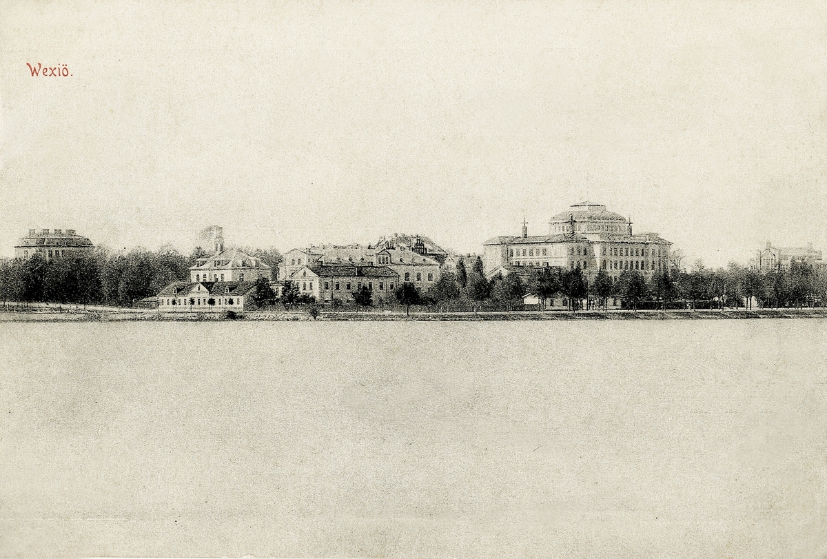 Utsikt från Kampen mot Söder, med fr.v.: Flickskolan, Växjö lasarett och Växjö högre allmänna läroverk, 1907.