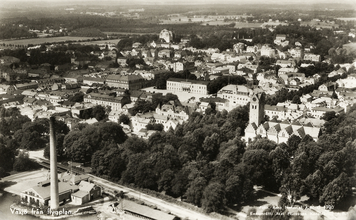 Växjö innerstad från flygplan, ca 1935-1940. Man ser bl a dåv. elverket med sin skorsten, stortorget med residenset och domkyrkan. I bakgrunden tornar Ringsbergsskolan (dåv. seminariet) upp sig.