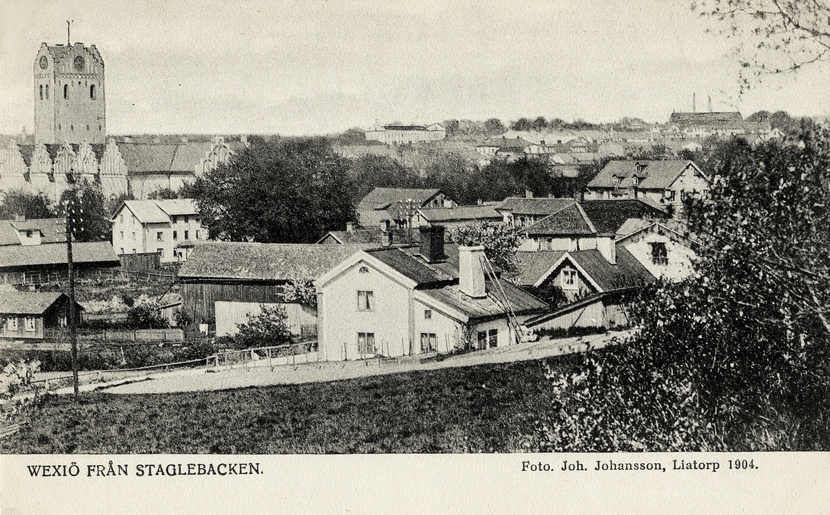 Utsikt från Staglebacken (Staglaberget), Växjö 1904. Man ser bla Gravaregården och bortom den domkyrkan.