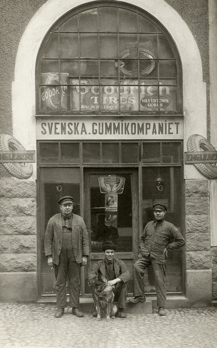 Anställda vid Svenska Gummikompaniet utanför firman, Norrgatan, Växjö.