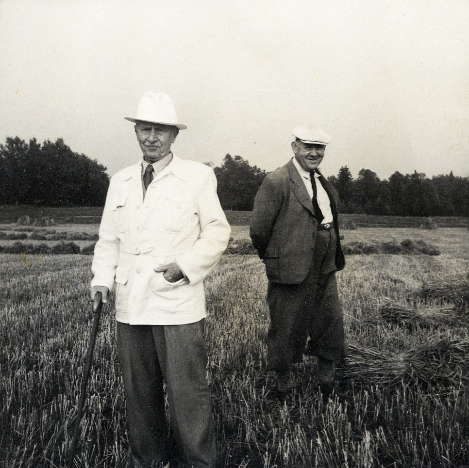 Två män står på en åker. Till vänster greve Christer Bonde (af Björnö), till höger inspektor Ludvig Jönsson.