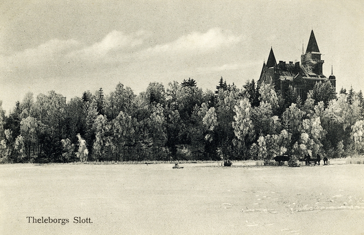 Vy över Trummen mot det nyuppförda Teleborgs slott, 1904. På isen sysslar man troligen med isupptagning.
