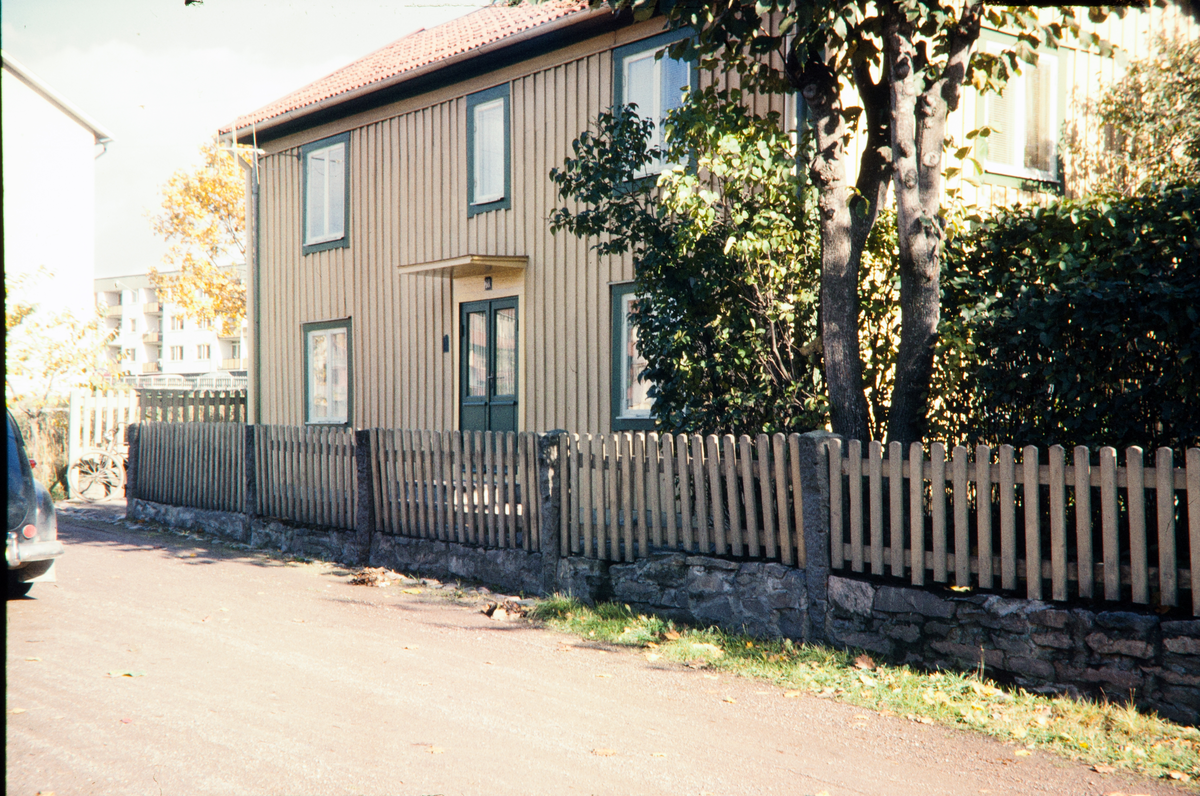 Ett bostadshus vid en väg, Växjö. Gamla Norr (?). I bakgrunden skymtar ett nybyggt hyreshus.
