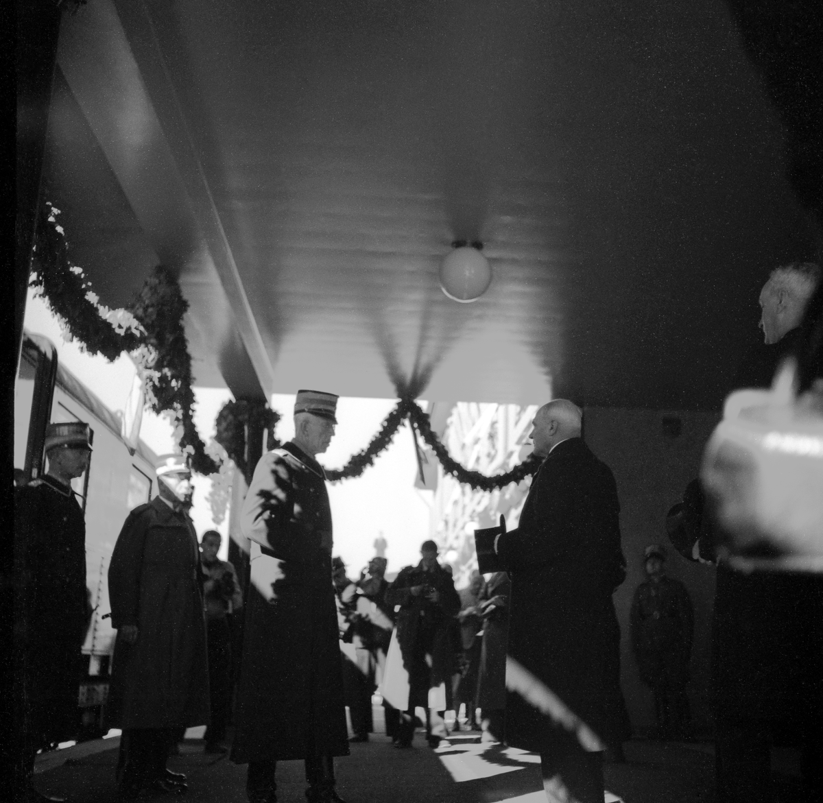 Kung Gustaf V:s mottagande i Växjö, 1939. Kungen anländer till järnvägsstationen i Växjö och blir mottagen på perrongen.
