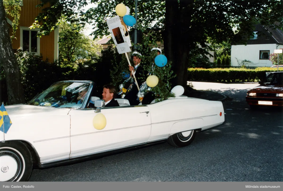 Studentexamen på Fässbergsgymnasiet i Mölndal den 5 juni 1997. Två studenter får transport i en gammal amerikansk bil. Fotografi taget på Frejagatan.