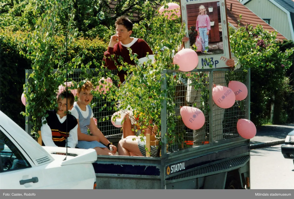 Studentexamen på Fässbergsgymnasiet i Mölndal den 5 juni 1997. En student får transport i en släpkärra. Fotografi taget på Frejagatan.