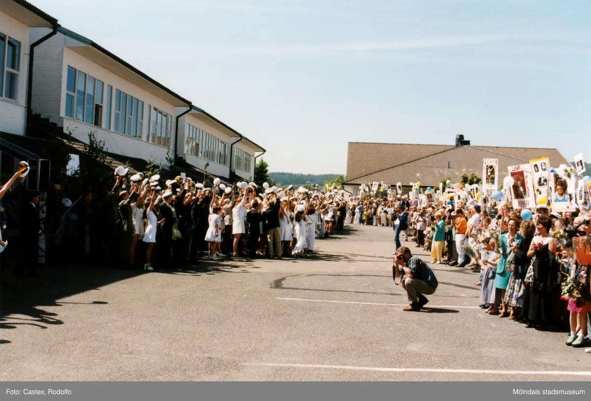 Studentexamen på Fässbergsgymnasiet i Mölndal den 5 juni 1997. Studenterna har kommit ut från skolbyggnaden och möts av familj och vänner på skolgården.