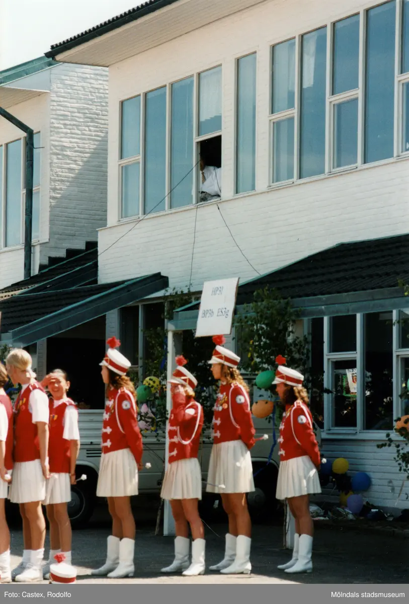 Studentexamen på Fässbergsgymnasiet i Mölndal den 5 juni 1997. Utanför skolbyggnaden står medlemmar ur Mölndals Paradorkester.