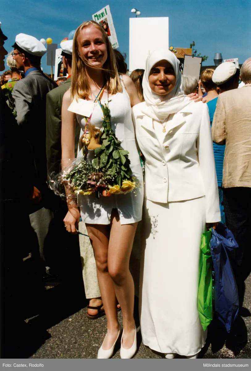 Studentexamen på Fässbergsgymnasiet i Mölndal den 5 juni 1997. Porträtt av två kvinnliga studenter.