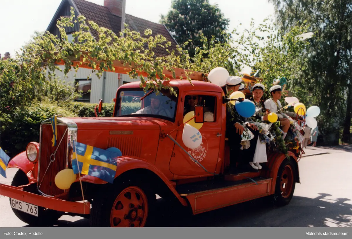 Studentexamen på Fässbergsgymnasiet i Mölndal den 5 juni 1997. En samling studenter får transport av en gammal brandbil. Fotografi taget på Frejagatan.