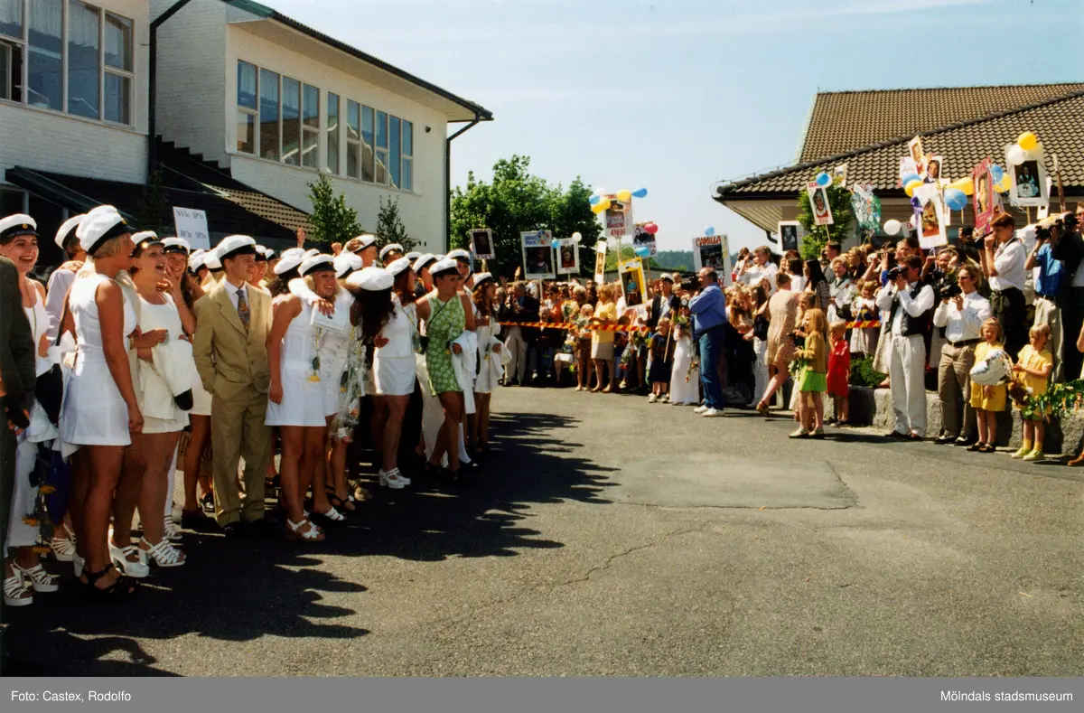 Studentexamen på Fässbergsgymnasiet i Mölndal den 5 juni 1997. Studenterna har kommit ut från skolbyggnaden och möts av familj och vänner på skolgården.