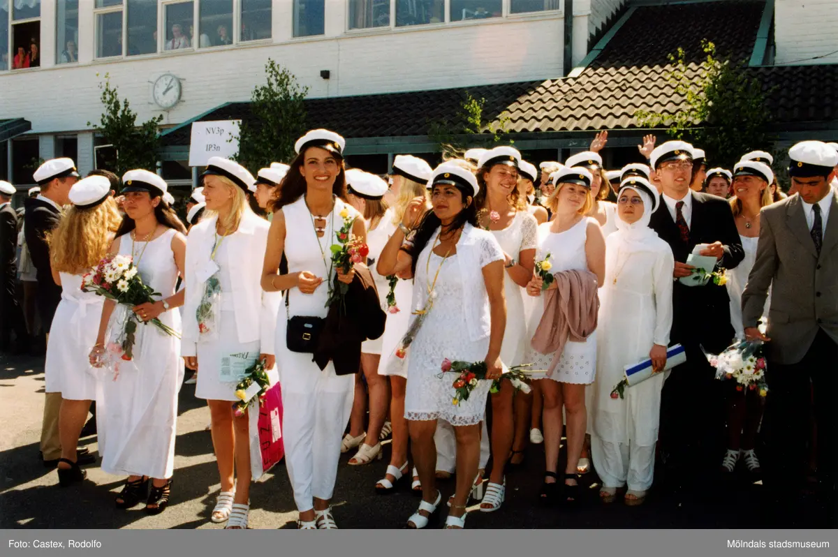 Studentexamen på Fässbergsgymnasiet i Mölndal den 5 juni 1997. Studenterna har kommit ut från skolbyggnaden.
