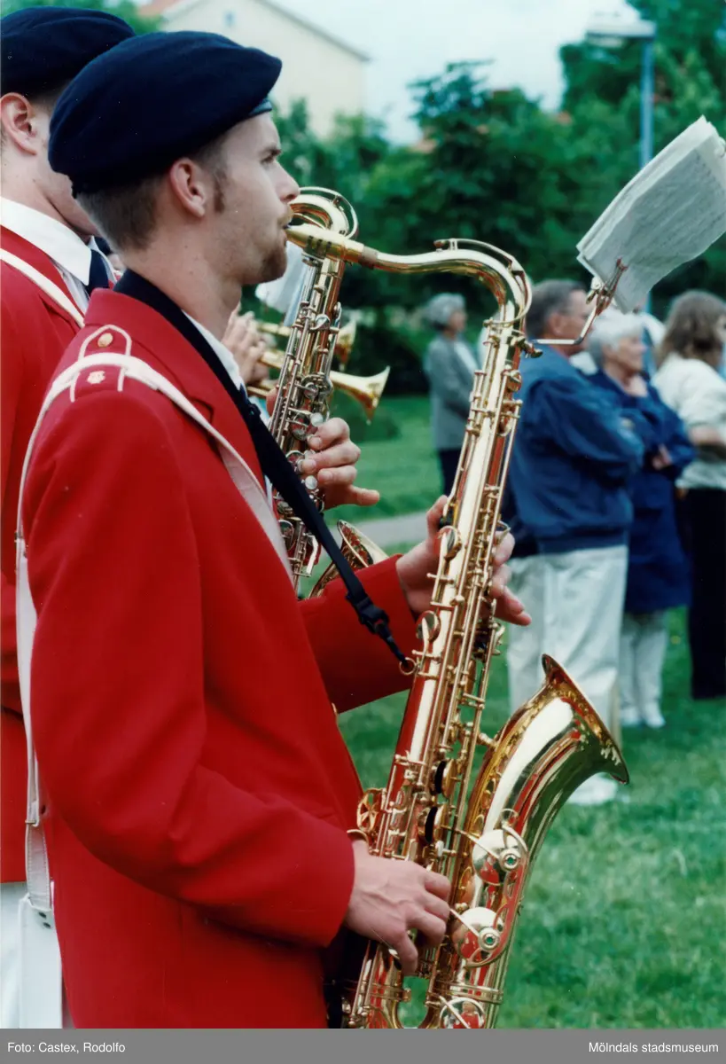 Titel: Nationaldagsfirande i Stadshusparken i Mölndal den 6 juni 1999. Musikunderhållning av Mölndals Paradorkester.
