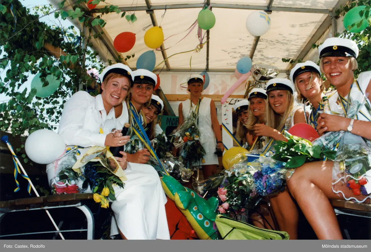 Studentexamen på Fässbergsgymnasiet i Mölndal den 5 juni 1997. Porträtt av en samling kvinnliga studenter som får transport på ett lastbilsflak. Fotografi taget på Frejaplan.