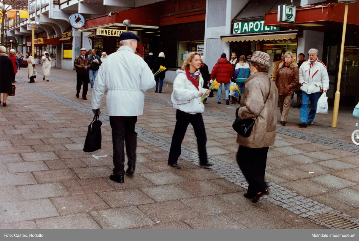 Medlemmar i fotbollsföreningen Jitex BK delar ut blommor till folk i Mölndals centrum i mars 1992. En kvinna och en man får blommor på Brogatan.