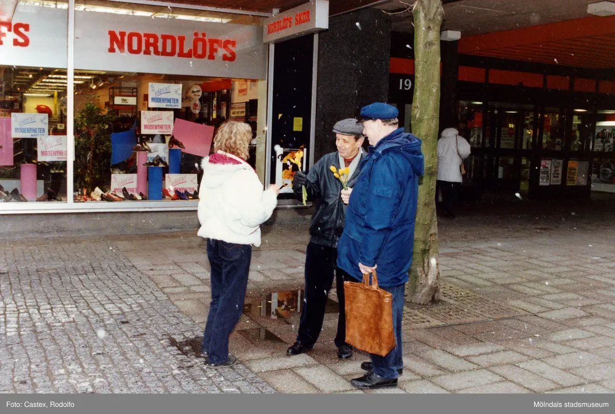 Medlemmar i fotbollsföreningen Jitex BK delar ut blommor till folk i Mölndals centrum i mars 1992. Två män får blommor på Brogatan.