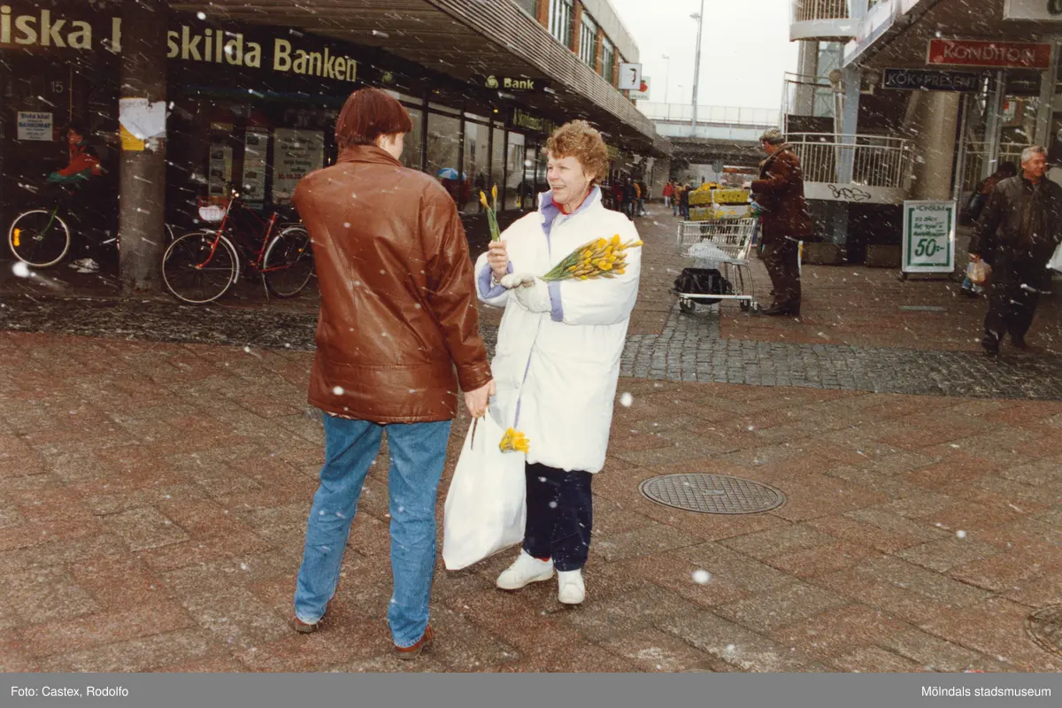 Medlemmar i fotbollsföreningen Jitex BK delar ut blommor till folk i Mölndals centrum i mars 1992. En kvinna får blommor i korsningen Brogatan-Nygatan. SEB i bakgrunden.