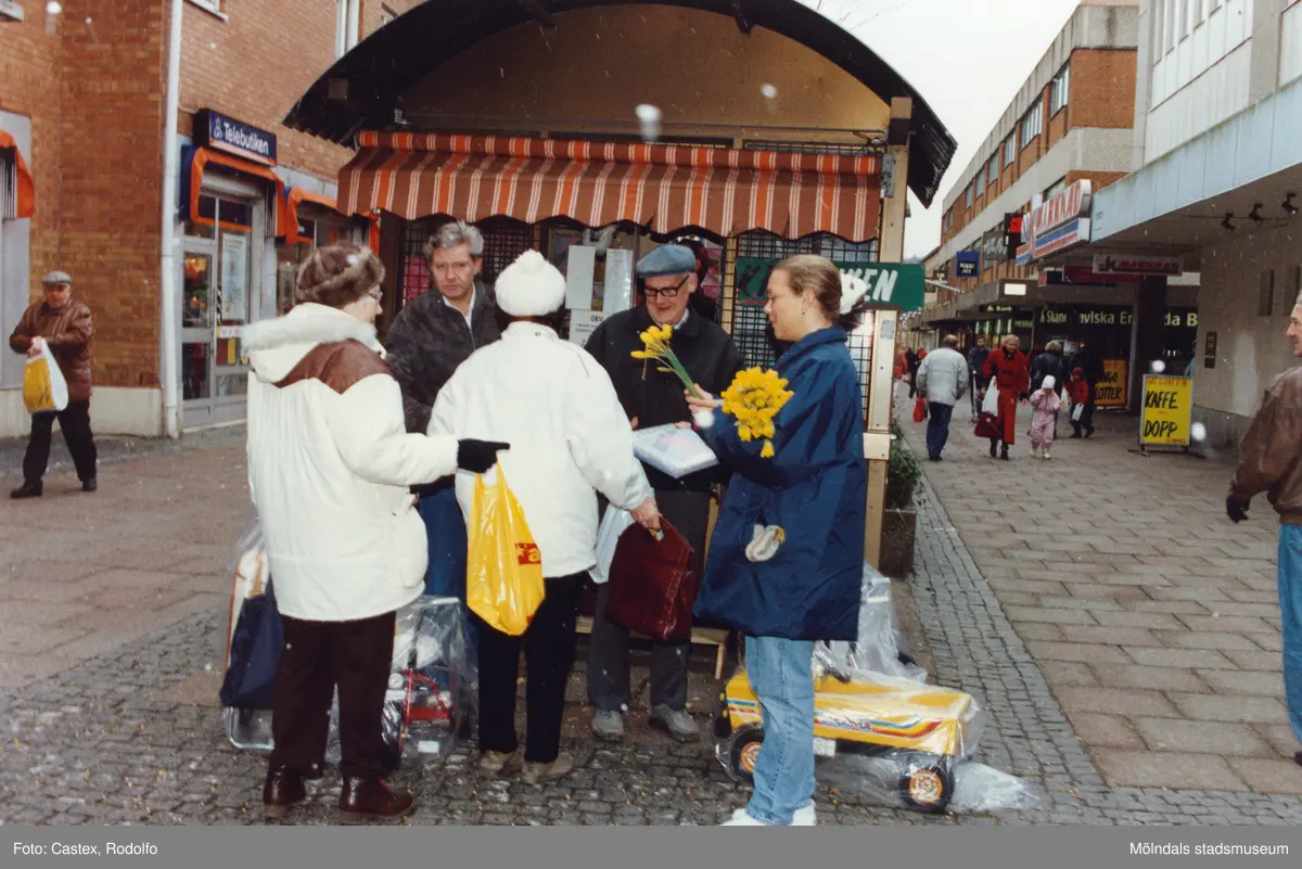 Medlemmar i fotbollsföreningen Jitex BK delar ut blommor till folk i Mölndals centrum i mars 1992. Ett par kvinnor och män får blommor på Brogatan.