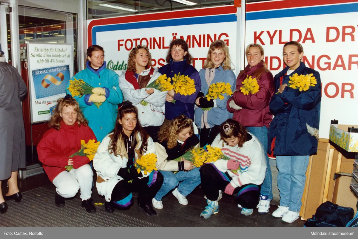 Medlemmar i fotbollsföreningen Jitex BK delar ut blommor till folk i Mölndals centrum i mars 1992. Grupporträtt av Jitex-spelare som har blommor att dela ut. Fotograferat utanför K-marknad på Brogatan.