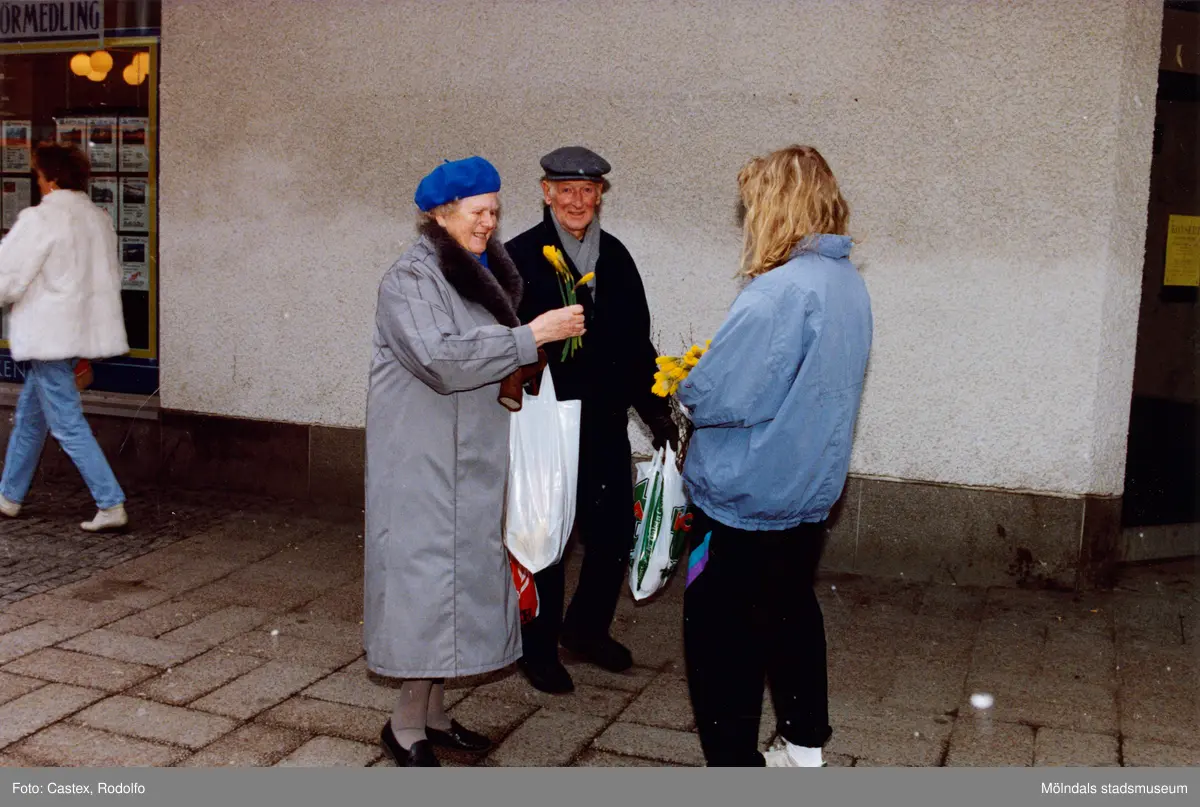 Titel: Medlemmar i fotbollsföreningen Jitex BK delar ut blommor till folk i Mölndals centrum i mars 1992. En kvinna och en man får blommor på Brogatan.