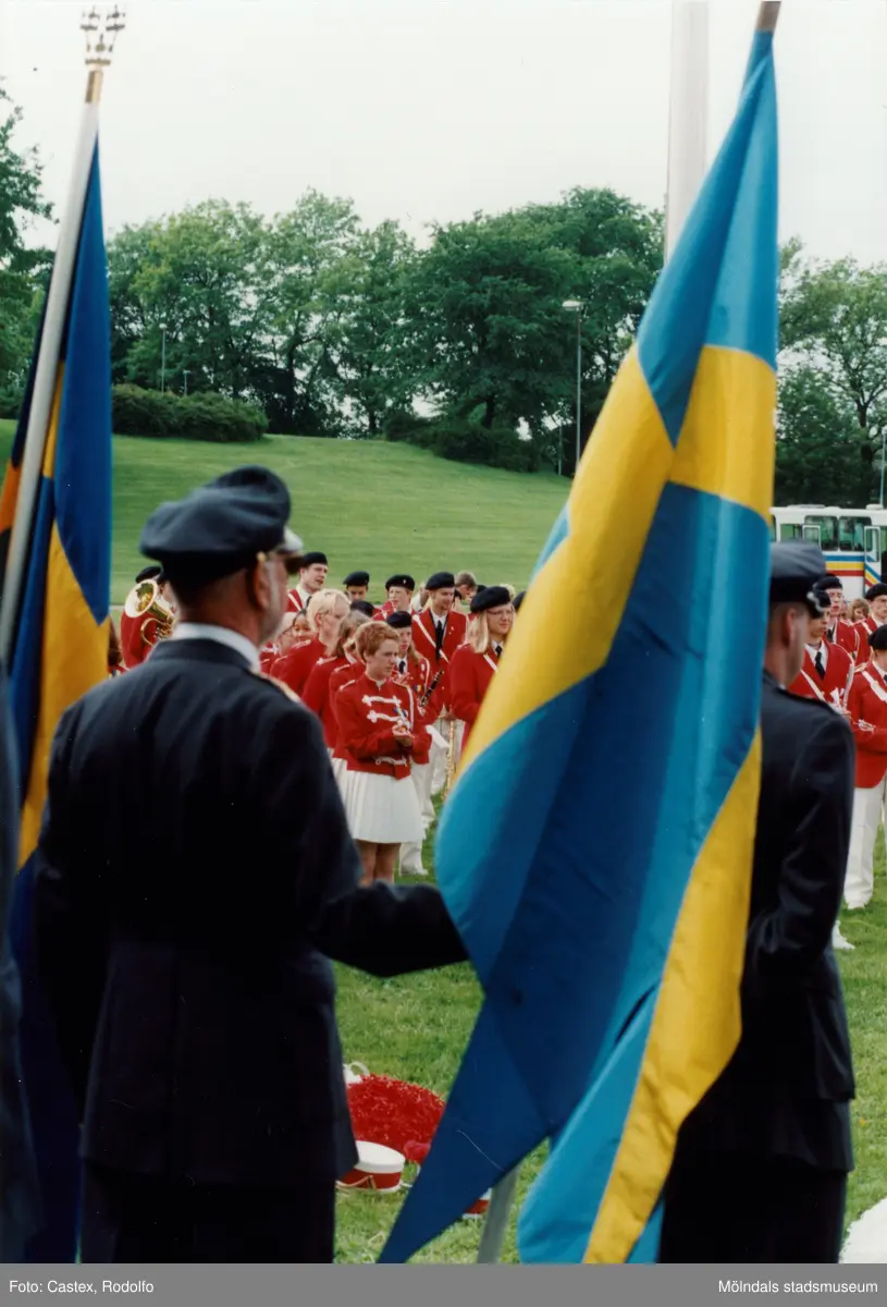 Nationaldagsfirande i Stadshusparken i Mölndal den 6 juni 1999. I förgrunden män som håller upp den svenska flaggan, i bakgrunden Mölndals Paradorkester.
