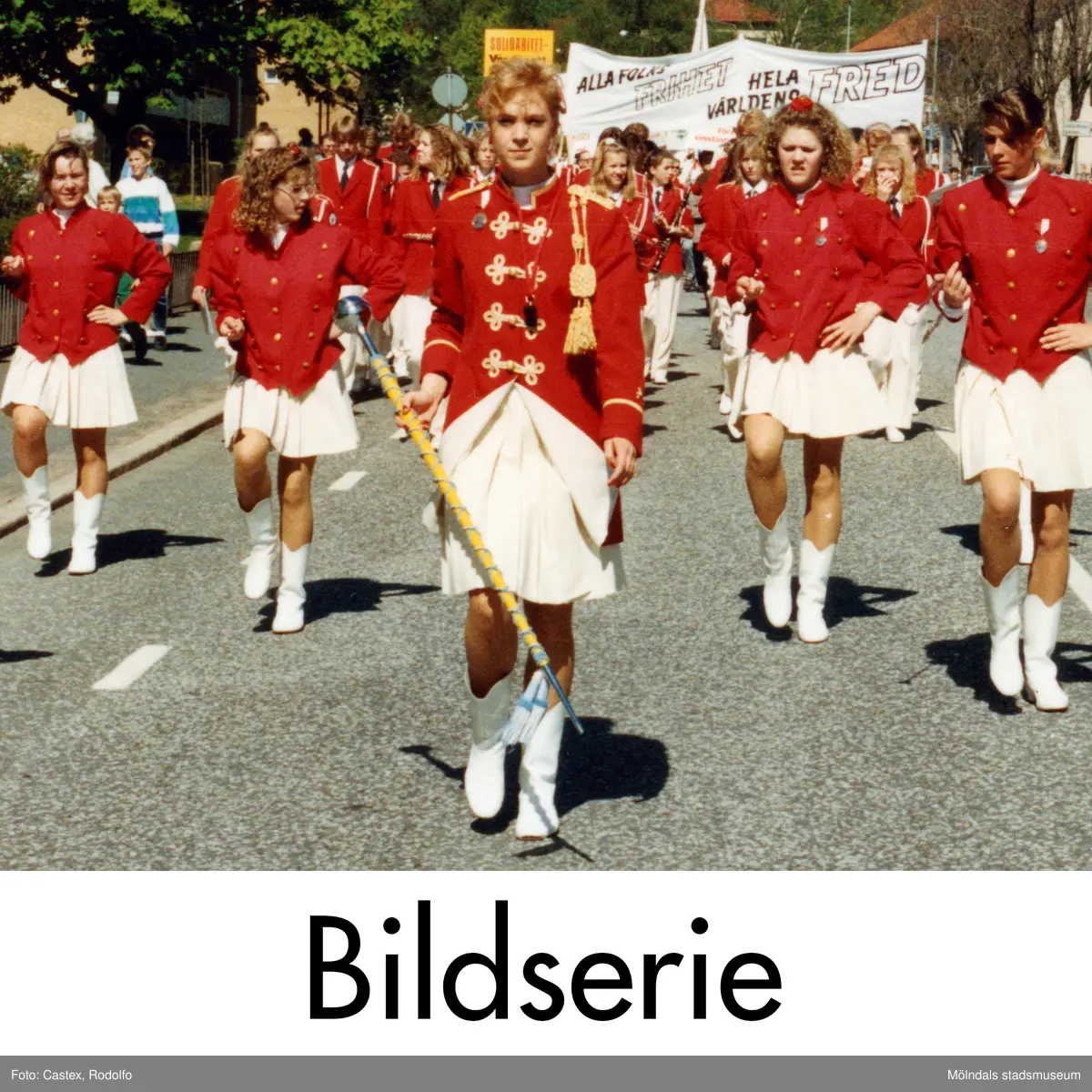 Serie om 12 fotografier som visar Mölndals Paradorkester i ett demonstrationståg på Häradsgatan i Bosgården, Mölndal, den 1 maj 1990. I serien ingår även ett grupporträtt av orkestern taget i stadshusparken samt några bilder när de underhåller med musik på samma plats.