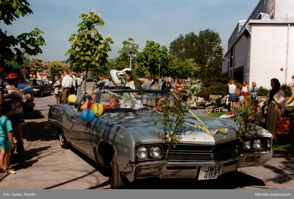 Studentexamen på Fässbergsgymnasiet i Mölndal den 5 juni 1997. En student får transport i en gammal amerikansk bil. Bilen kör ut från Frejaplan till Frejagatan. Aktiviteten/Idrottshuset ses till höger.