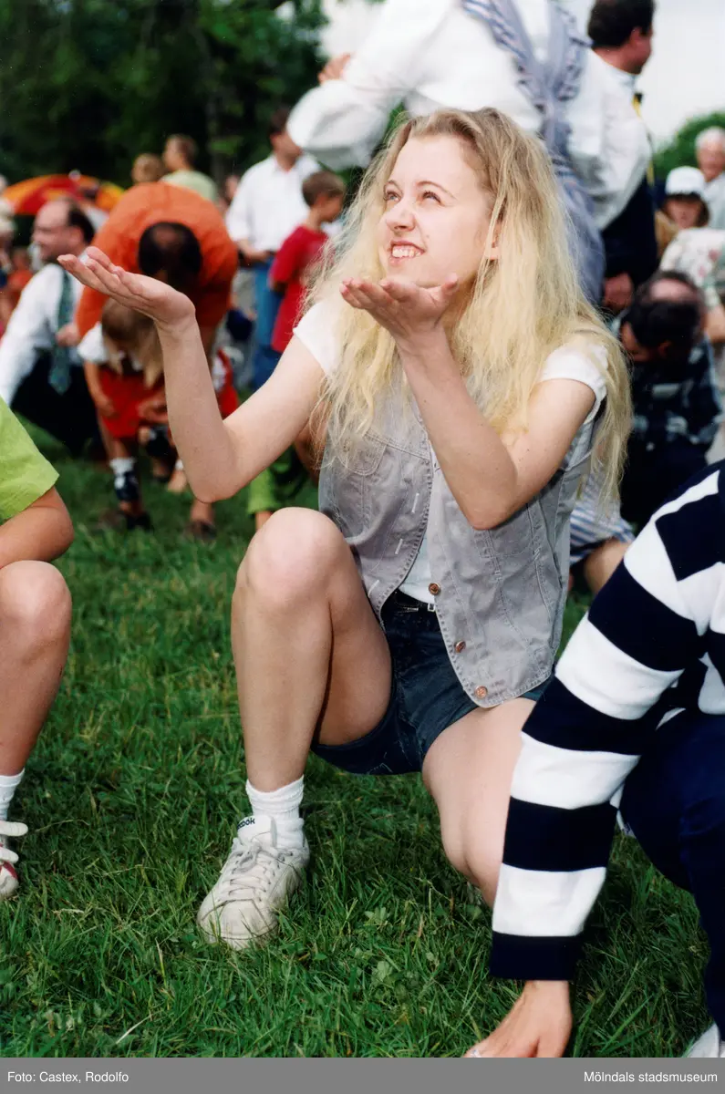 Midsommarfirande vid Gunnebo slott i Mölndal, okänt årtal. Dans kring midsommarstången.