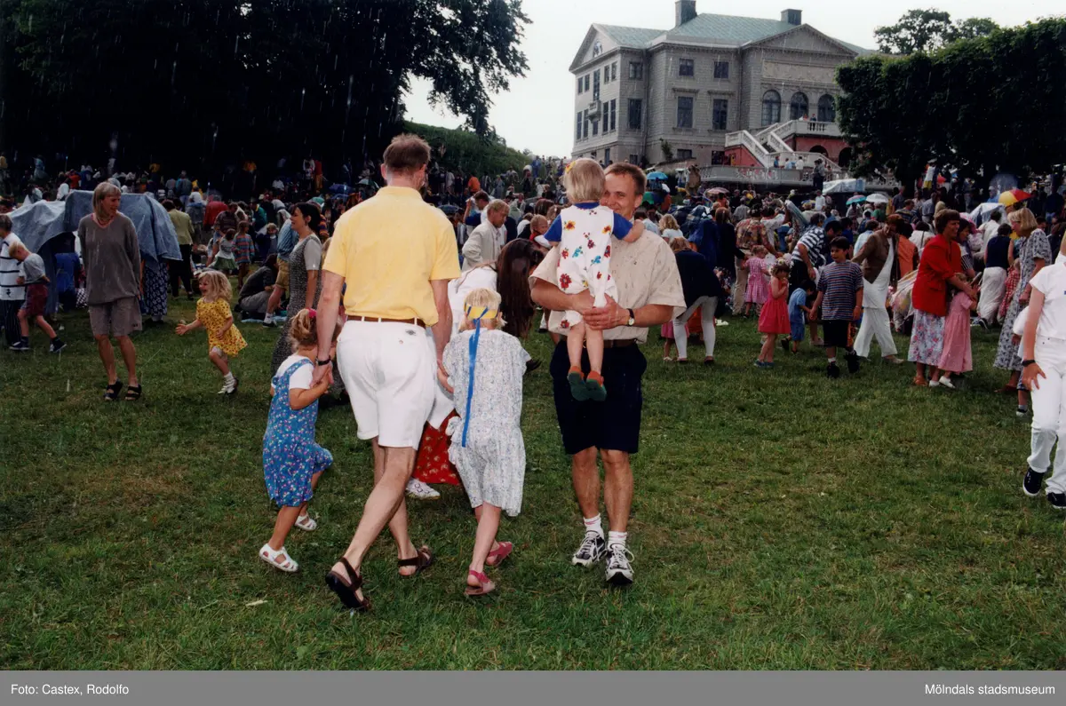 Midsommarfirande vid Gunnebo slott i Mölndal, okänt årtal. Det har börjat regna. Slottet i bakgrunden.