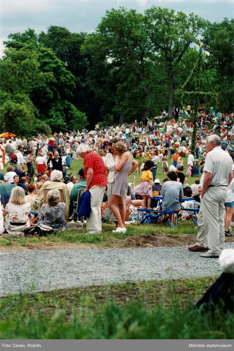 Midsommarfirande vid Gunnebo slott i Mölndal, okänt årtal. Dans kring midsommarstången.