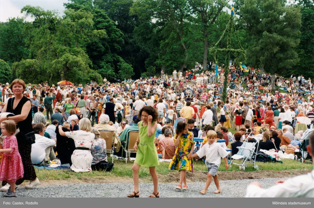 Midsommarfirande vid Gunnebo slott i Mölndal, okänt årtal. Dans kring midsommarstången.