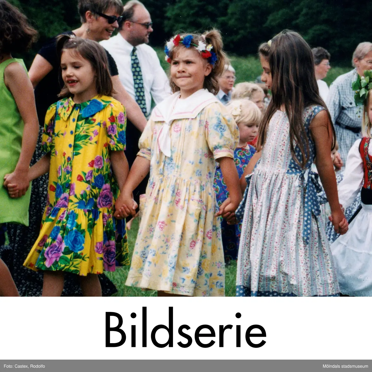 Serie om nio fotografier som visar midsommarfirande vid Gunnebo slott i Mölndal på 1990-talet.