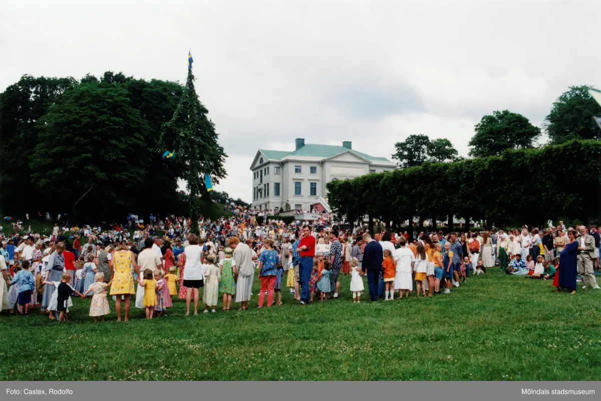 Midsommarfirande vid Gunnebo slott i Mölndal på 1990-talet. Dans kring midsommarstången. Slottet i bakgrunden-