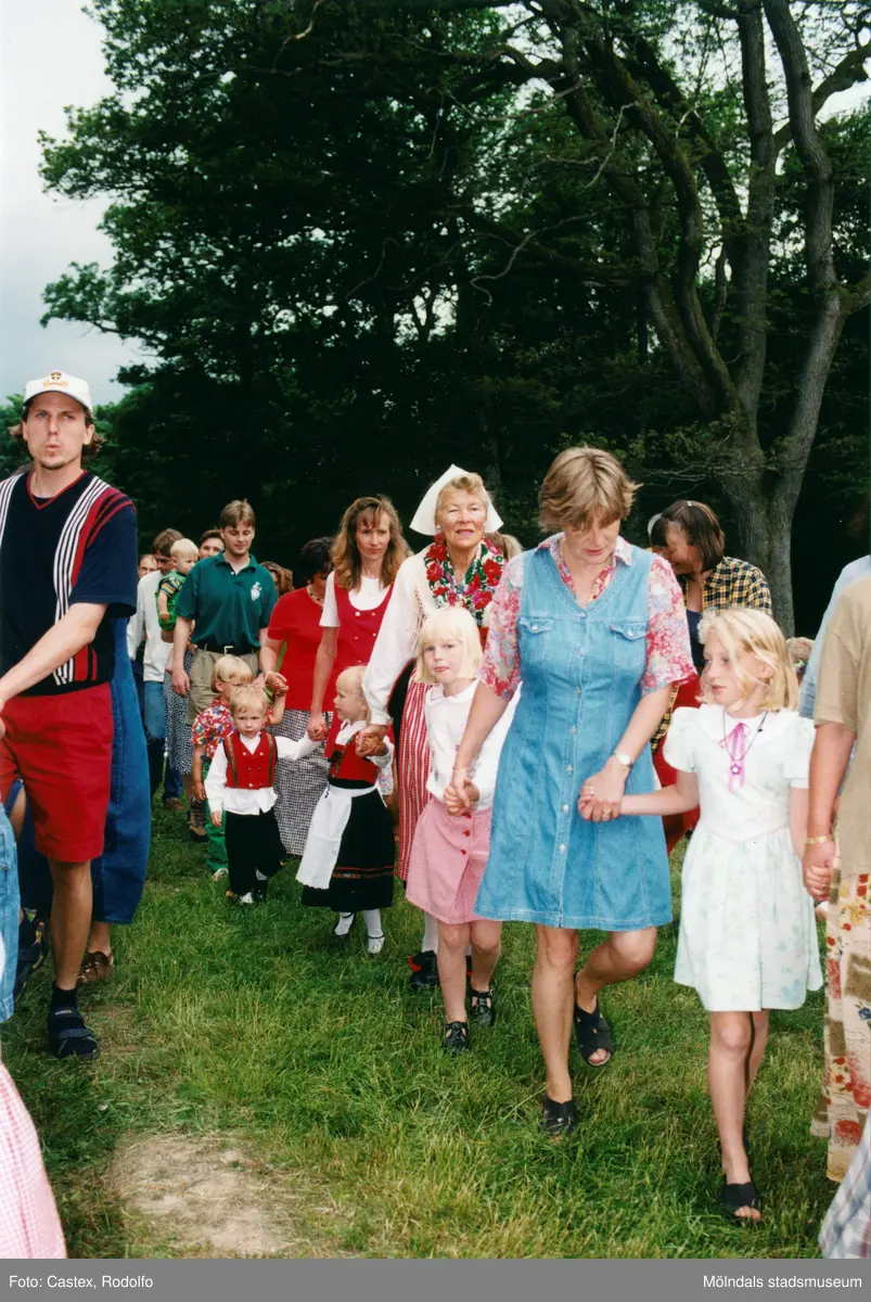 Titel: Midsommarfirande vid Gunnebo slott i Mölndal, okänt årtal. Små och stora deltar i dansen kring midsommarstången.