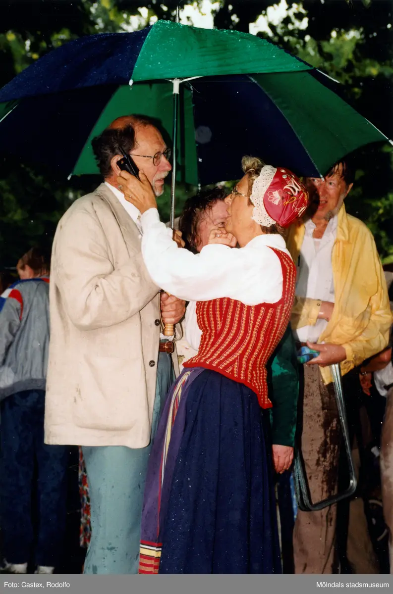 Midsommarfirande vid Gunnebo slott i Mölndal, okänt årtal. En kvinna och en man har tagit skydd undan regnet med ett paraply.