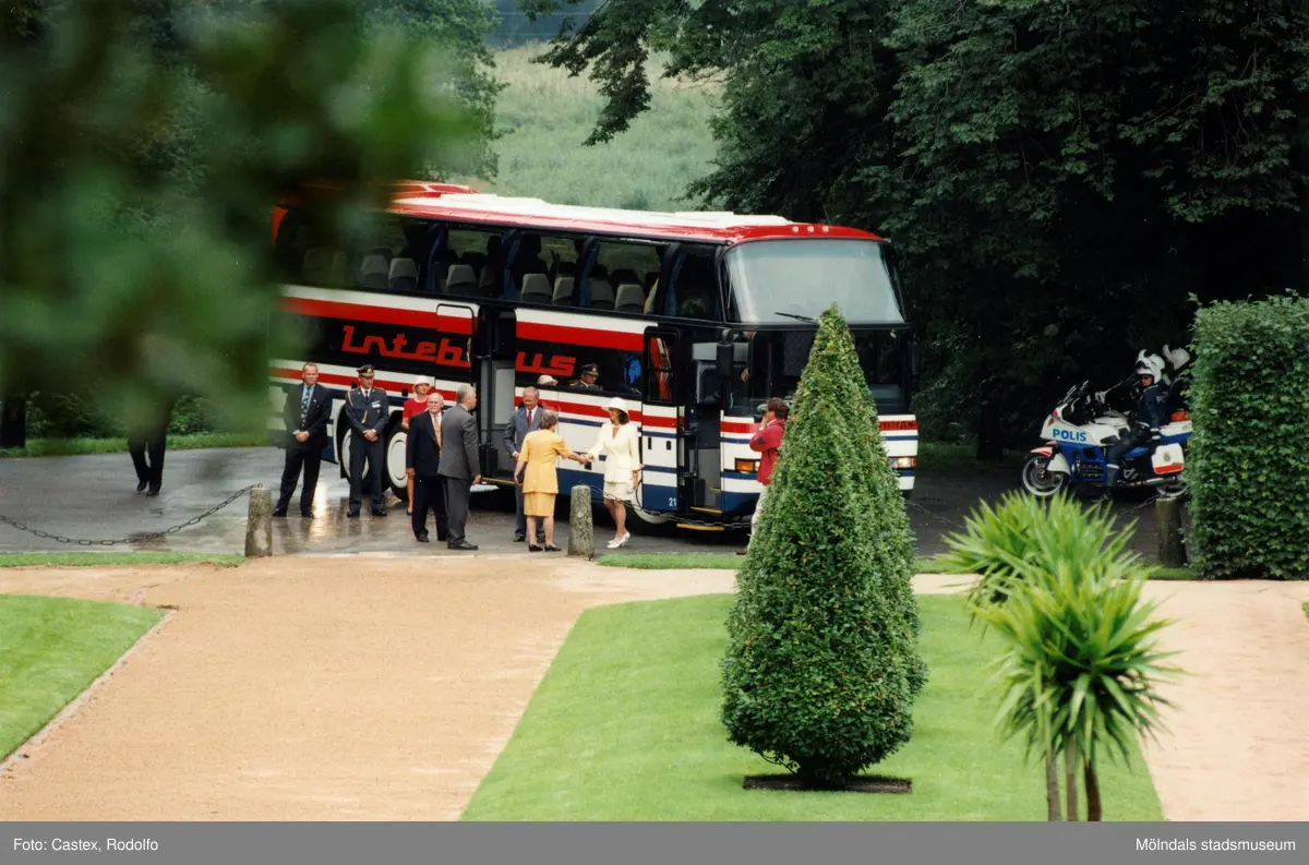 Det svenska kungaparet på besök vid Gunnebo slott i Mölndal den 28 augusti 1997. Här har man precis anlänt Gunnebo med buss.