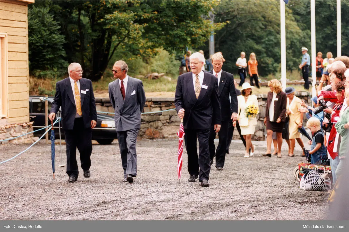 Det svenska kungaparet på besök vid Gunnebo slott i Mölndal den 28 augusti 1997. Här promenerar man vid Tjenstefolksbostaden - kafé och konferenslokal.