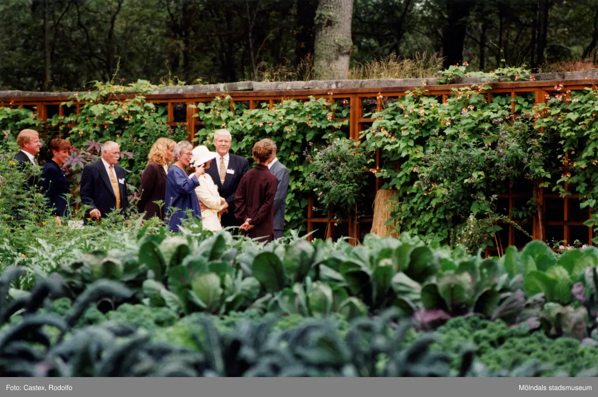 Det svenska kungaparet på besök vid Gunnebo slott i Mölndal den 28 augusti 1997. Här står man i köksträdgården.