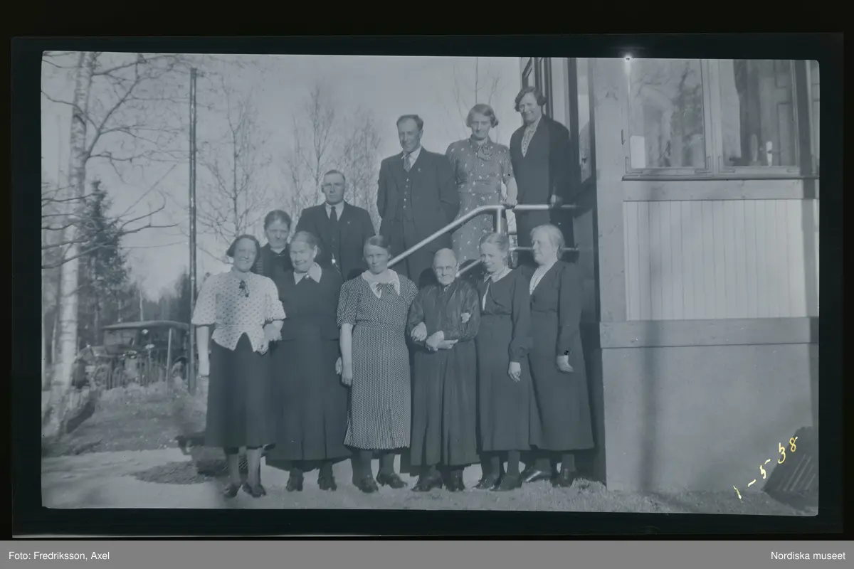 Grupporträtt. Kvinnor och män poserar på trappen till ett hus.