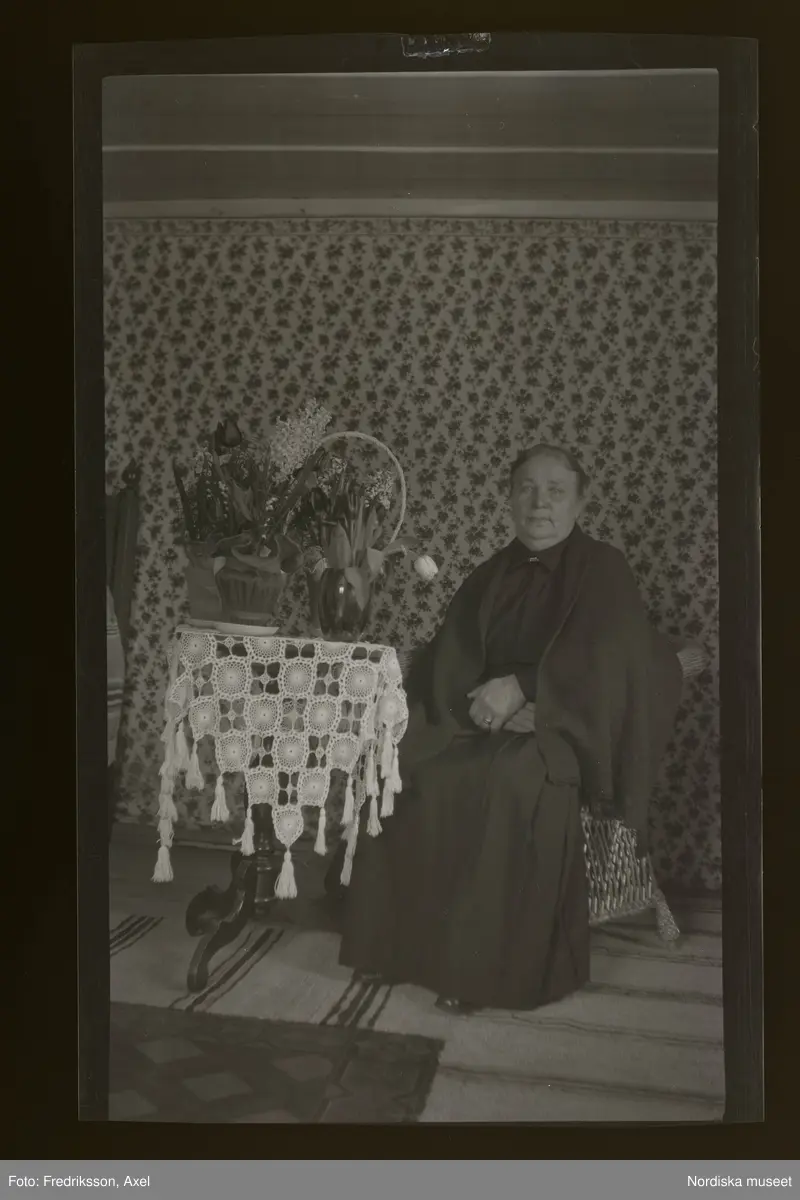 Titel: "Mina Karlsson, Hedäng" En kvinna sitter i ett rum med blomminga tapeter, vid ett litet bord med virkad duk. På bordet står gratulations-blommor.