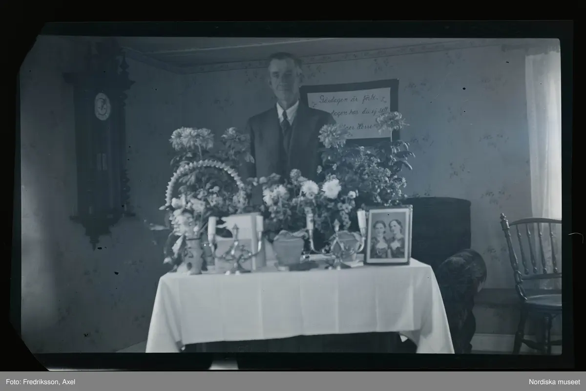 Porträtt av en man som står vid ett bord med gratulations-blommor.