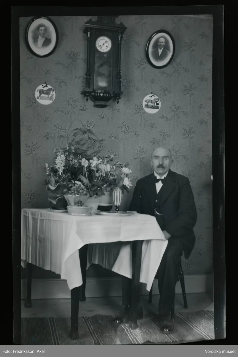 Porträtt av en man som sitter vid ett bord med gratulations-blommor.