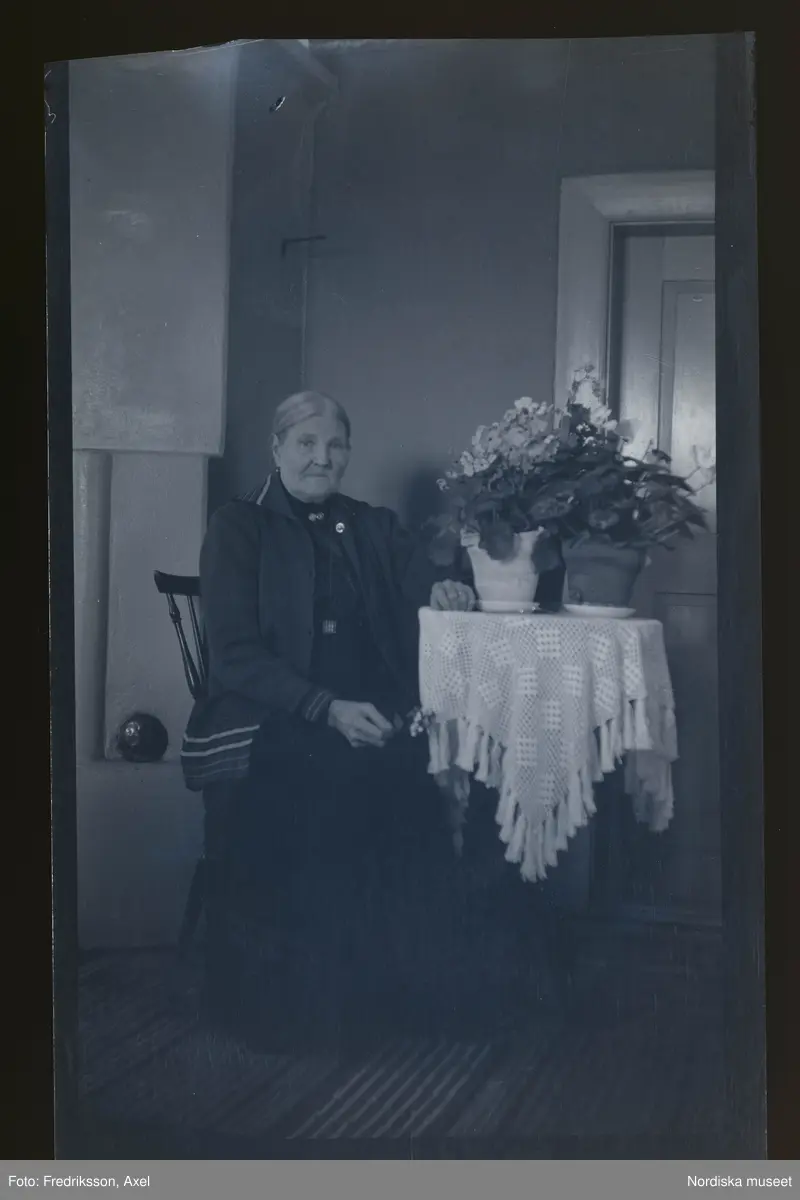 Porträtt av en kvinna som sitter vid ett bord med blomkrukor.