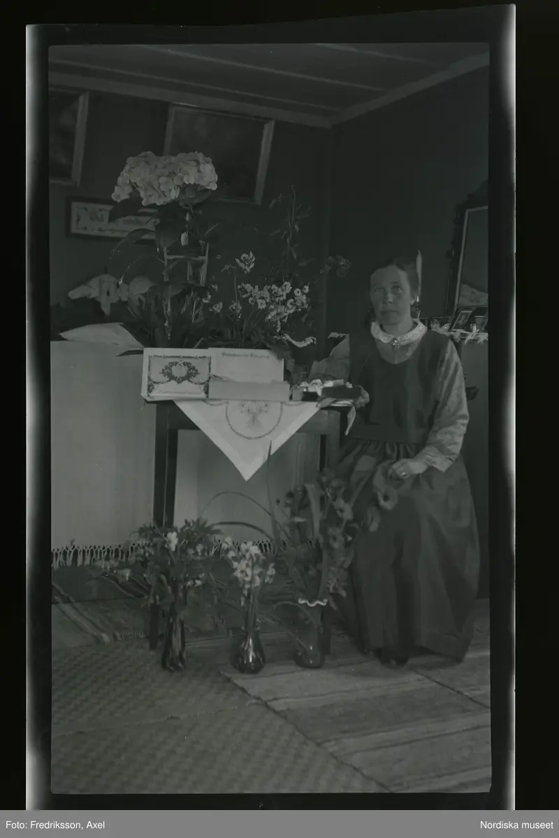 Porträtt av en kvinna som sitter vid ett bord med gratulations-blommor.