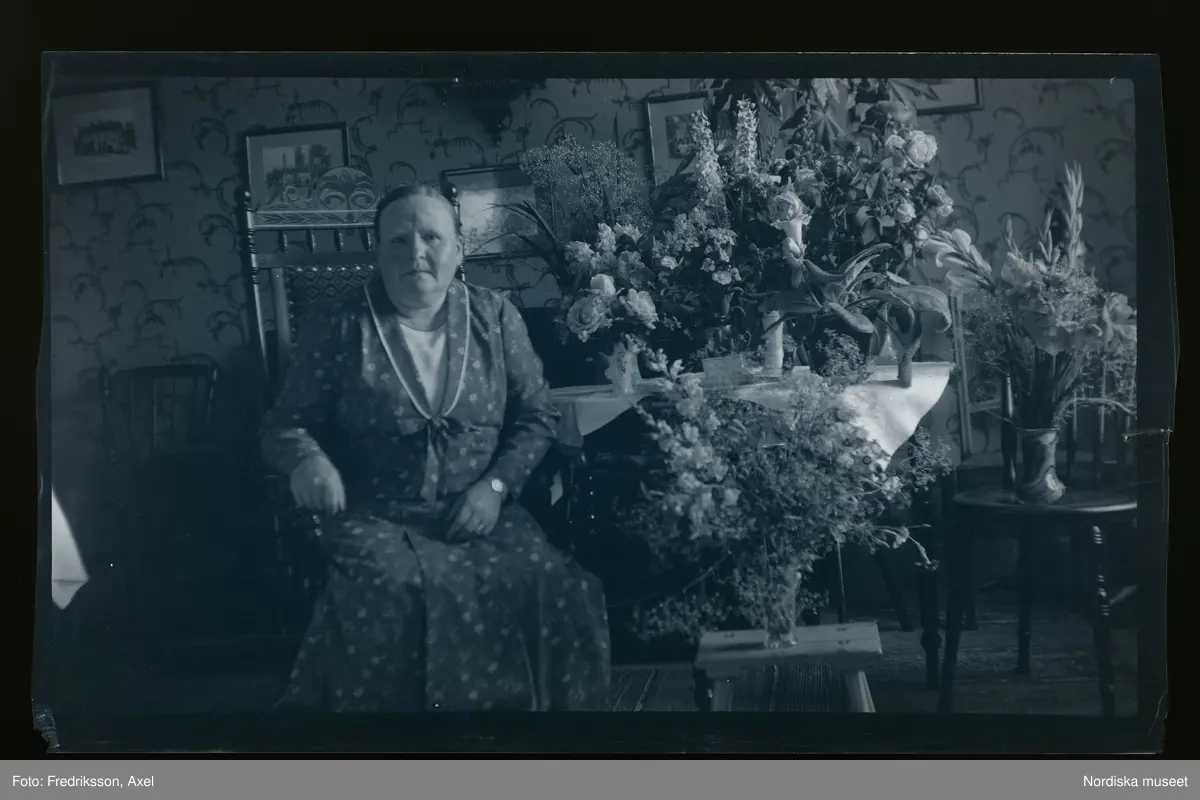 En kvinna sitter vid ett bord fullt av gratulations-blommor.