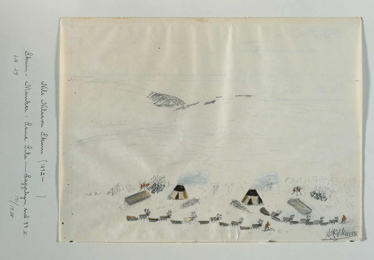 Teckning av Nils Nilsson Skum, troligen utförd mellan 1930 och 1938. Två kåtor i vintervistet, samer på skidor har lastat raider med kött och hudar.