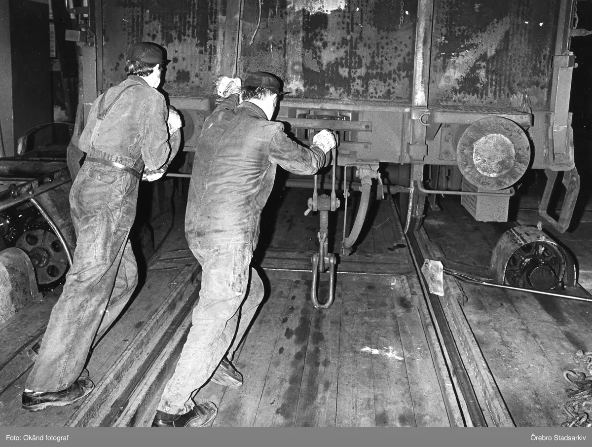Arbetare skjuter på järnvägsvagn på Centralverkstäderna, 1970-tal