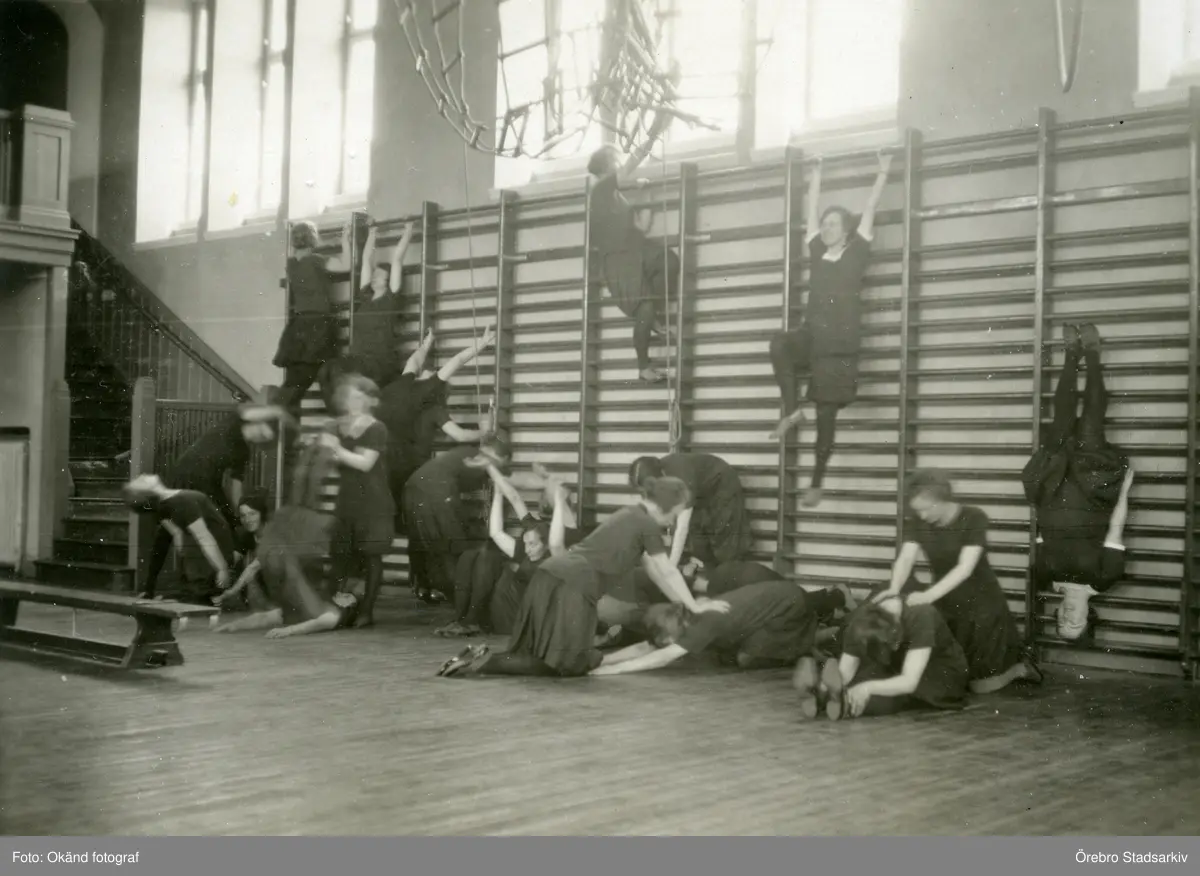 Elever vid Örebro läns småskollärarinneseminarium har gymnastik med tänjningsrörelser, 1920-tal