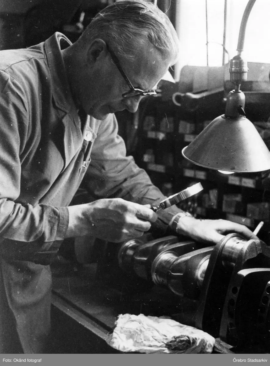 Arbetare på Centralverkstäderna synar en vevaxel, 1953