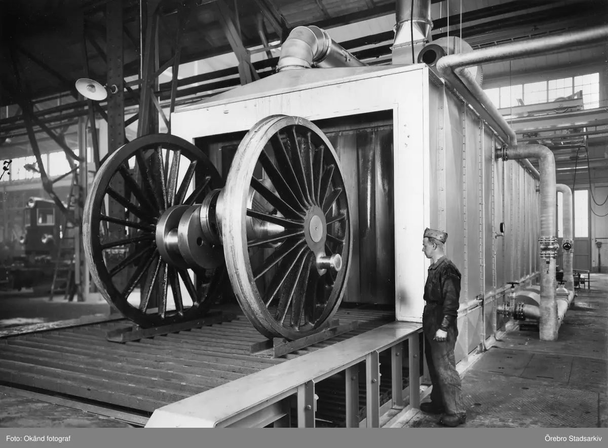 Arbetare övervakar tvättmaskien för rengöring av lokdetaljer på Centralverkstädernas lokverkstad, 1960-tal